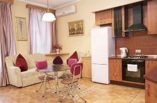 There is a bedroom including sofa bed, a hall wardrobe with mirror, table for shoes, slippers and shoes care set, ironing board, iron. Apartments offer living and dining areas and modern bathroom with bathtub, sink, toilet, bide, washing machine (laundry detergent, fabric softener), an individual shower set. Technical equipment is provided including Satellite TV, stereo, DVD, air conditioning, Wi-FI, local phone are included.